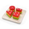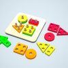 The wooden pieces come in 4 shapes and 4 bright colors. Kids just slide them onto the Matching pegs, Building Eye and Hand Coordination and Logical Thinking Skills while they are playing.